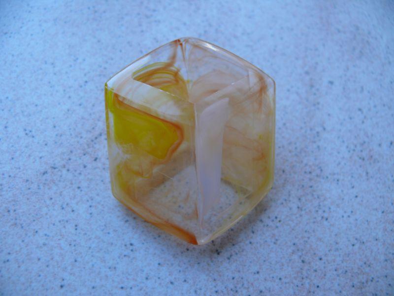 | Popis:- umělohmotný šátkový průvlak zajímavého tvaru - popsat tento tvar slovy je dost složité, tak si prosím v případě zájmu rozklikněte průvlak č.1684 perleťový světle zelený, tam jsou fota v detailu - vel. 3,5 x 4,5 - vel. otvoru 2,4 x 1,7 - barva základu průsvitná lesklá hodně žíhaná žlutou, trochu bílou a občas i oranžovou |