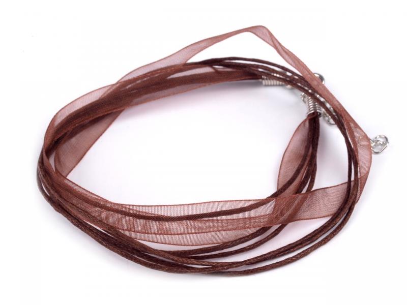 | Popis:- pro vytvoření originálního náhrdelníku - stačí zavěsit přívěsek nebo donut - tři bavlněné tenčí šňůrky (o průměru cca 1 mm) doplněné stuhou stejné barvy (šířka 6 mm) - zapínání na karabinku + prodlužovací řetízek - kov stříbrný bižuterní - délka 44 cm + 4 cm řetízek ... barva tmavě hnědá ... |