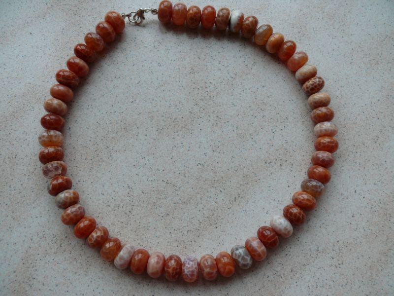 | Popis:-výběrový náhrdelník z krásných velkých ohnivých achátů (prům. 1,25 cm)- kamínky mají tvar vyšších bochánků - délka 44 cm - náhrdelník navlečen na potaženém pevném lanku, zapínání z pravého stříbra Ag 925. Na požádání mohu připojit k náhrdelníku prodlužovací řezízek s pevnými většími oky ze stříbrného obecného kovu (bez obsahu niklu) v délce podle Vašeho přání - zdarma... |