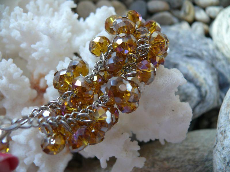 | Popis:- krásný náhrdelník ze skleněných broušených korálků - vyhotoven technikou zvanou ketlování, díky které se vytváří krásné bohaté hrozny - kombinace skla a stříbrného bižuterního kovu. Barva topazově žlutá se zrcadlovými odlesky ... Velikost 1 korálku 0,8 cm ... Náhrdelník: maximální délka 55 cm - (mohu vám jej zkrátit na požadovanou délku nebo si jej můžete sami upravit zkrácením řetízků) - délka korálkové části 22 cm - šířka cca 1,5 cm - šířka středového hroznu 2 cm - délka hroznu 4 cm ....... |