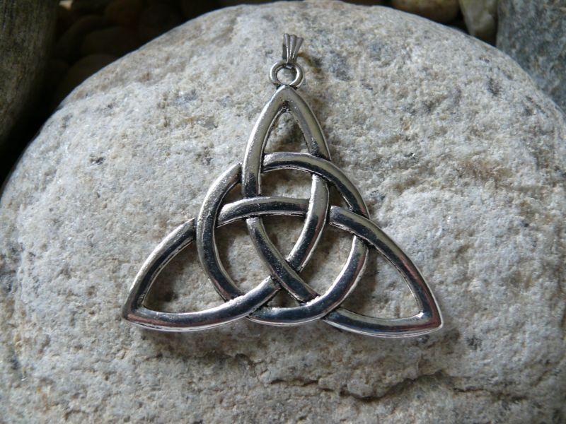 | Popis:- výrazný magický přívěsek z bižuterního kovu - velikost 5 x 4,5 cm + velké závěsné očko (závěsné očko je z chirurgické oceli) ... tento přívěsek můžete zavěsit na řetízek, kůži, lanko, stuhu, šňůrku velký výběr závěsných materiálů v různých barvách, se zapínáním i bez najdete v sekci Kameny-Kůže,lanka aj. ....... Trojná bohyně (Triquetra, Trinity) - jedná se o geometrický symbol, trojúhelníkového tvaru, po příchodu křesťanství často používaný jako symbol Nejsvětější trojice, který se skládá ze tří vzájemně propletených oblouků (ze tří symbolů ryb - tzv. vesica piscis), někdy s kruhem okolo.