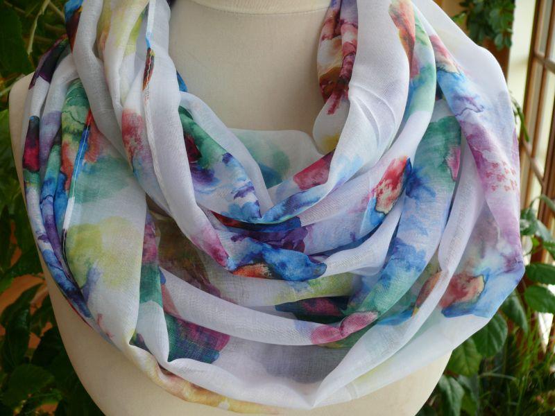 Popis:- širší, splývavý tunel z jemného hedvábí 30% a viskózy 70% - hodí se ke každému oblečení - vzor ve stylu malby akvarel - bílý podklad s barevnou malbou ... rozměry 180 x 70 cm ... moc pěkný, jemný a splývavý materiál, příjemný na nošení ...... tunel je typ šály, která je v koncích sešitá a tím spojená - kolem krku se omotává podle potřeby - většinou stačí 1x obtočit, tak jak můžete vidět na fotu :-)