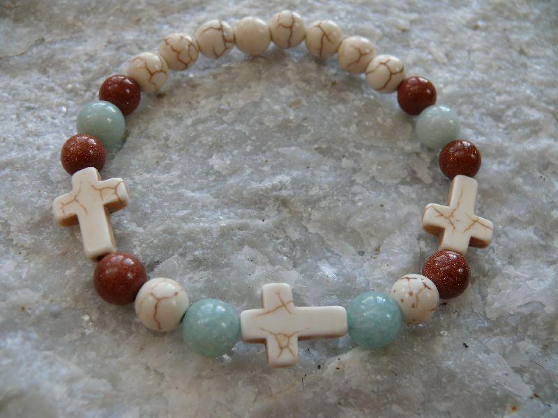 Popis:- autorský, pružný náramek - křížky a kuličky křepelčího kamene v kombinaci s angelitem a syntetickým třpytivým slunečním kamenem - velikost kuliček 0,8 cm - vnitřní obvod náramku cca 19 - 19,5 cm (velikost náramku mohu na požádání upravit) ...