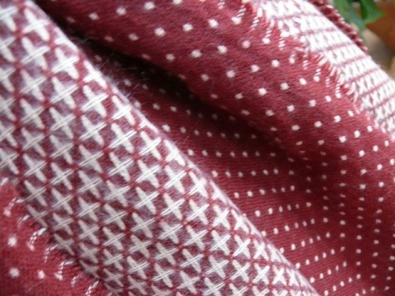 Popis:- krásná oboustranná a variabilní šála - z jedné strany puntík - z druhé vzorek v opačných barvách - působí moc hezky - teplá, hřejivá. Je vyrobena z příjemně měkkého materiálu. Hodí se ke kabátu, bundě i svetru. Na koncích zakončena jemnými třásněmi ... Šířka: 70 cm ... Délka: 200 cm ... Délka třásní: 1,5 cm ... Složení: akryl ... Barva: vínová v kombinaci se světlounce bílo-krémovou ...