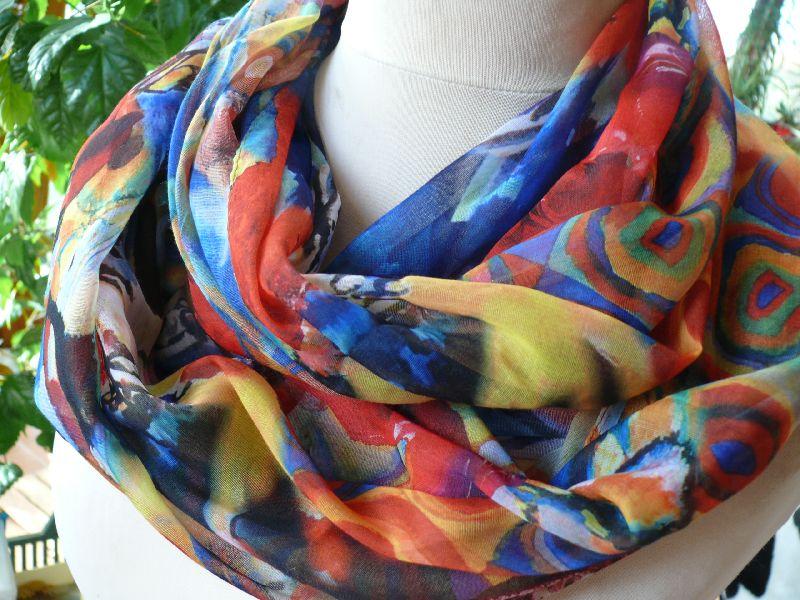 | Popis:- krásně jemný, splývavý tunel z 30% hedvábí a 70% viskózy - s pestrým abstraktním vzorem - foto tisk zaručuje nádherně zářivé barvy - tento tunel krásně oživí jednobarevné oblečení ... rozměry 170 x 70 cm ........ tunel je typ šály, která je v koncích sešitá a tím spojená - kolem krku se omotává podle potřeby - většinou stačí 1x obtočit, tak jak můžete vidět na fotu - lze ale i 2x obtočit :-) ... |