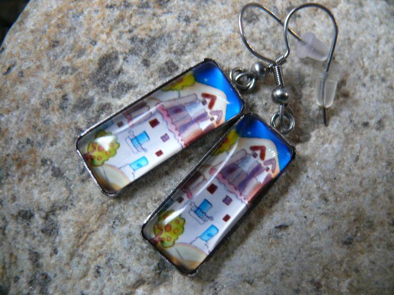 Popis:- moc hezké, originální, závěsné náušnice - do lůžka z chirurgické oceli je vsazen skleněný kabošon s krásnou kresbou - vše kovové je z chirurgické oceli - velikost obdélníku 1,1 x 2,6 cm ...
